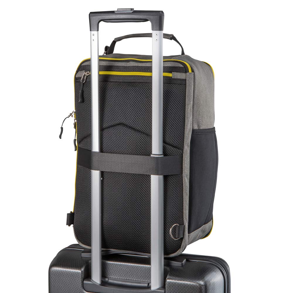 - UV-coated twill & Eco-suede construction. Rear luggage pass-through to combine easily with rolling luggage